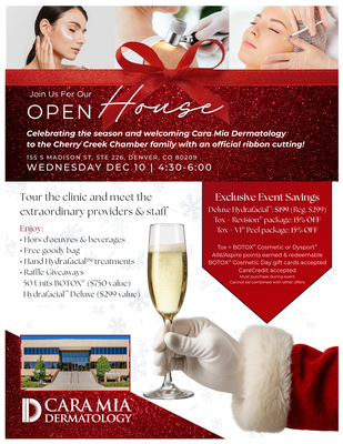 Join us for an open house and to celebrate the season and welcome Cara Mia Dermatology to the Cherry Creek Chamber family with an official ribbon cutting!